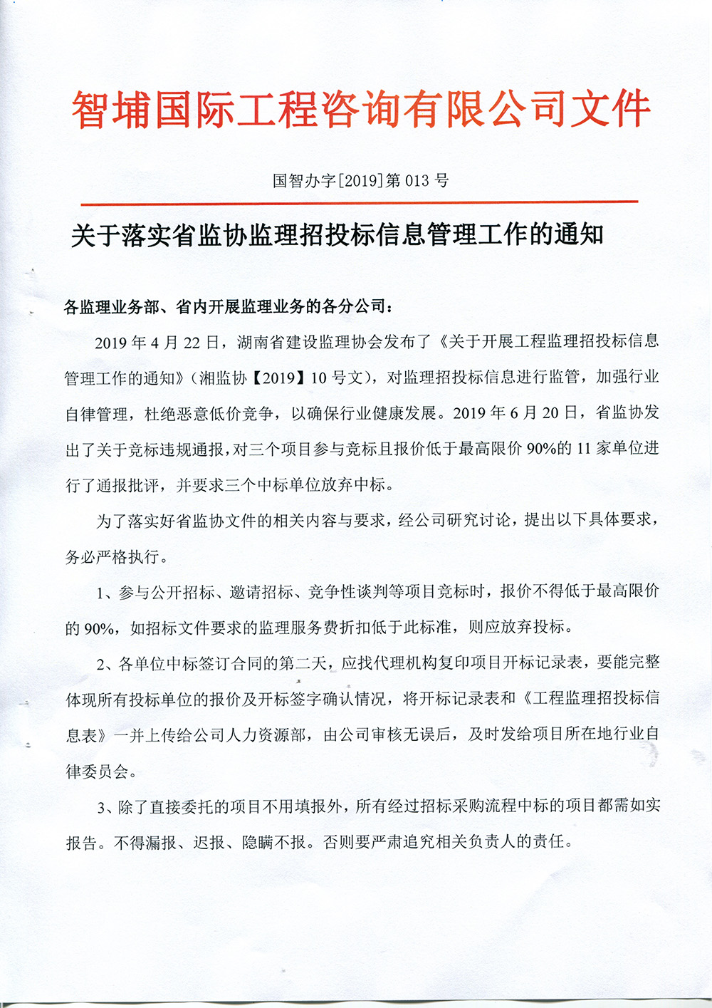 關(guān)于開(kāi)展工程監(jiān)理招投標(biāo)信息管理工作的通知 湘監(jiān)協(xié)〔2019〕10號(hào) 各會(huì)員單位: 為落實(shí)《湖南省建設(shè)工程監(jiān)理行業(yè)自律管理辦法》精神,進(jìn)一步規(guī)范市場(chǎng)秩序加強(qiáng)行業(yè)自律管理,2019年起將開(kāi)展工程監(jiān)理招投標(biāo)信息管理工作,現(xiàn)將相關(guān)事項(xiàng)通知如下: 一、建立全行業(yè)項(xiàng)目招投標(biāo)信息報(bào)告制度 定期在《湖南建設(shè)監(jiān)理》刊物或網(wǎng)絡(luò)平臺(tái)等發(fā)布全省工程監(jiān)理招投標(biāo)信息。信息采集方法為會(huì)員自報(bào)和行業(yè)自律委員會(huì)收集。會(huì)員在簽訂建設(shè)工程監(jiān)理合同后3天內(nèi),必須填寫(xiě)“工程監(jiān)理招投標(biāo)信息表”(見(jiàn)附表)并發(fā)至當(dāng)?shù)刈月晌瘑T會(huì)委員(以項(xiàng)目所在地為準(zhǔn))。行業(yè)自律委員會(huì)委員定期檢查責(zé)任區(qū)域內(nèi)是否有漏報(bào)、隱報(bào)項(xiàng)目招投標(biāo)信息的,一經(jīng)發(fā)現(xiàn)有漏報(bào)、隱報(bào)項(xiàng)目招投標(biāo)信息的,立即要求當(dāng)事企業(yè)補(bǔ)報(bào),并于每月底向協(xié)會(huì)秘書(shū)處報(bào)送匯總責(zé)任區(qū)內(nèi)項(xiàng)目招投標(biāo)報(bào)價(jià)信息。 二、加強(qiáng)信息管理推進(jìn)自律管理 發(fā)揮行業(yè)自律委員會(huì)作用,加強(qiáng)行業(yè)自律管理力度,通過(guò)工程監(jiān)理招投標(biāo)信息收集,進(jìn)行統(tǒng)計(jì)分析研究和建立信息庫(kù),全面掌握我省工程監(jiān)理行業(yè)市場(chǎng)競(jìng)爭(zhēng)情況,對(duì)于惡性競(jìng)爭(zhēng)低價(jià)發(fā)包的行為,按照《湖南省建設(shè)工程監(jiān)理行業(yè)自律管理辦法》規(guī)定進(jìn)行批評(píng)、約談和懲戒。年底將既低于成本價(jià)簽訂合同又在各市州價(jià)格排名倒數(shù)5名之內(nèi)的項(xiàng)目,作為第二年行業(yè)自律重點(diǎn)關(guān)注項(xiàng)目。對(duì)漏報(bào)、隱報(bào)項(xiàng)目招投標(biāo)信息的企業(yè)在《湖南建設(shè)監(jiān)理》上公布名單,并作為誠(chéng)信等級(jí)評(píng)價(jià)的扣分項(xiàng)。對(duì)于項(xiàng)目低價(jià)發(fā)包的行為,開(kāi)展維護(hù)行業(yè)權(quán)益的行動(dòng),采取與業(yè)主溝通、向主管部門反映情況等措施。